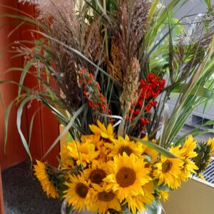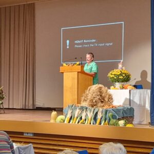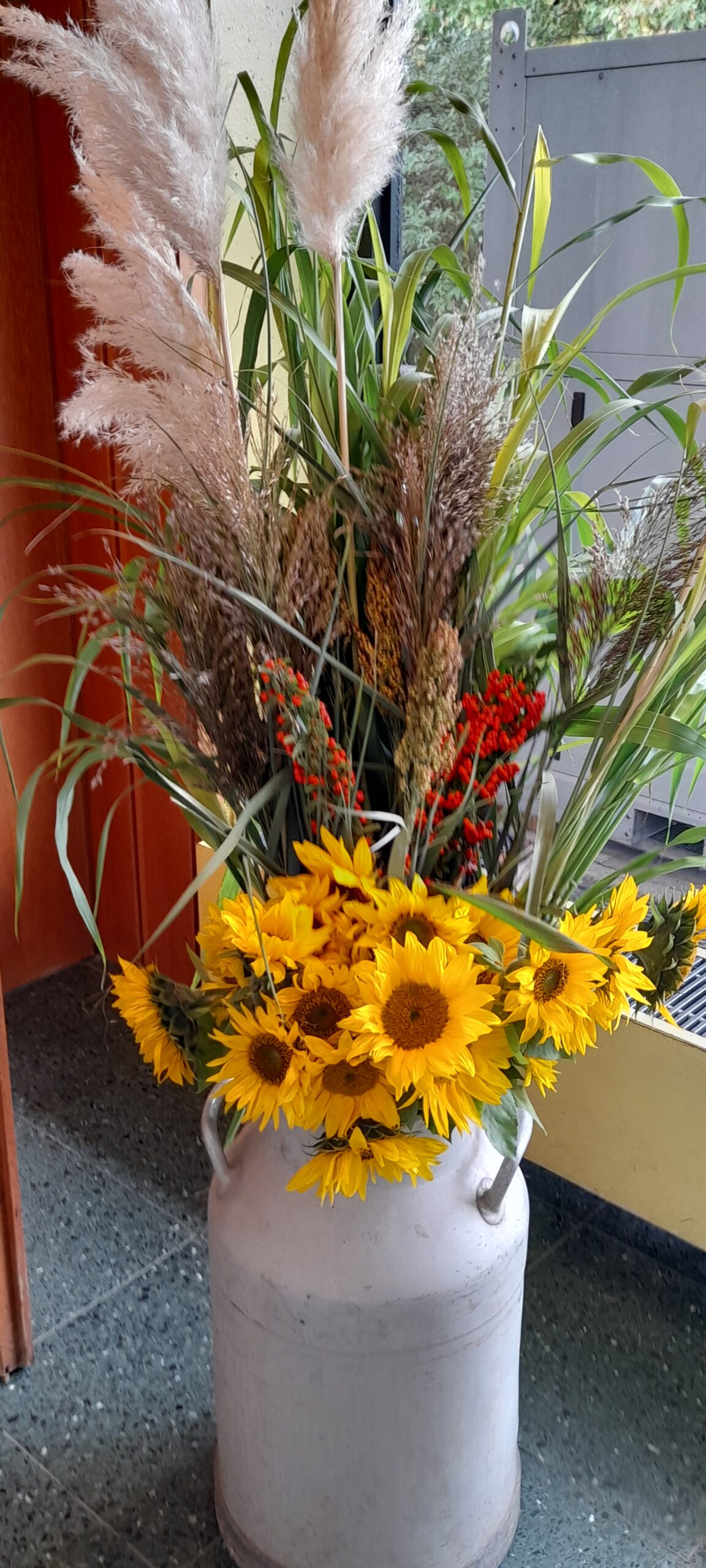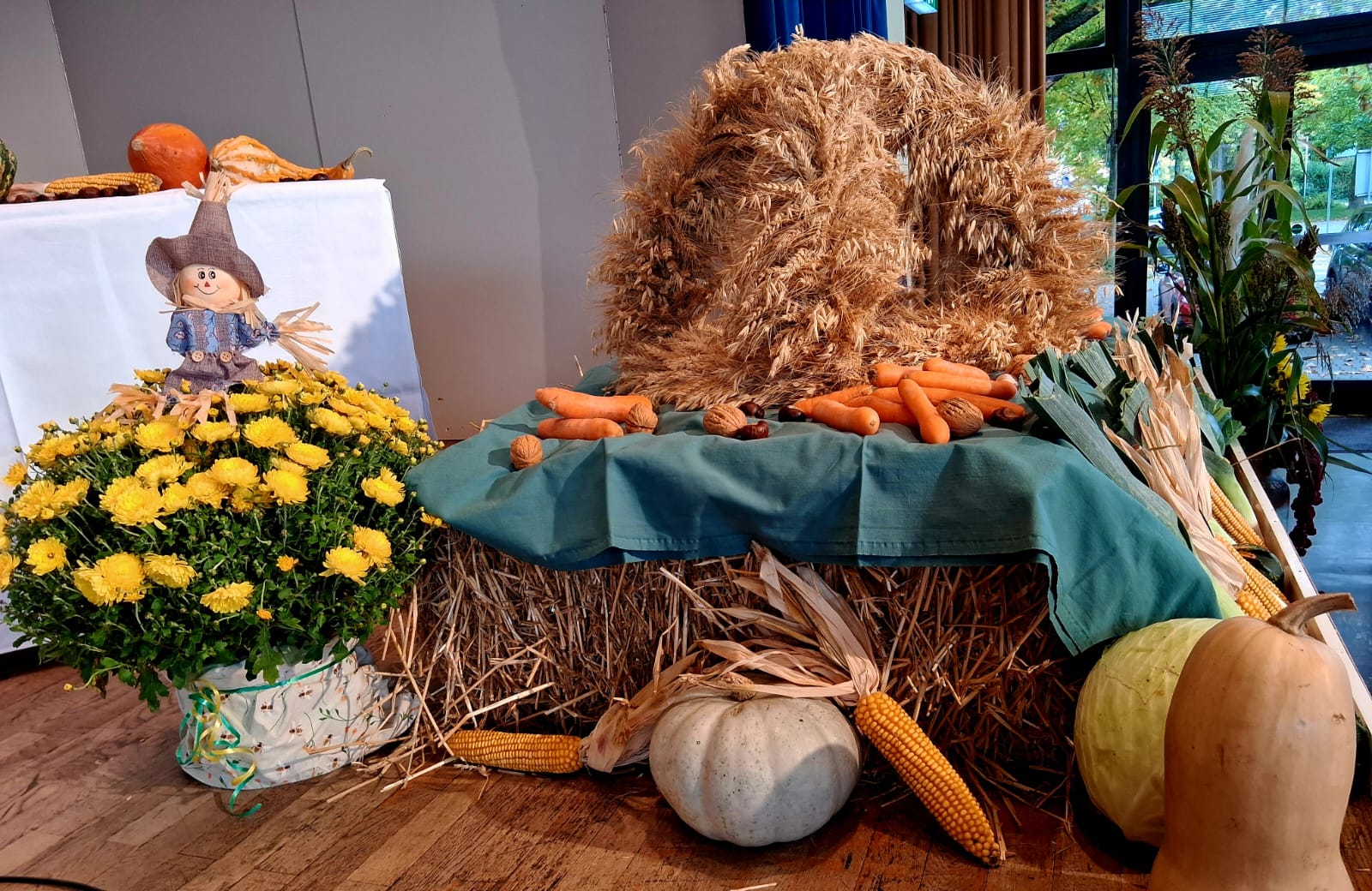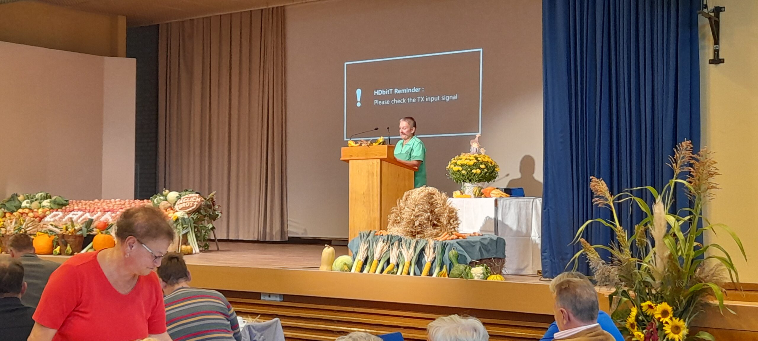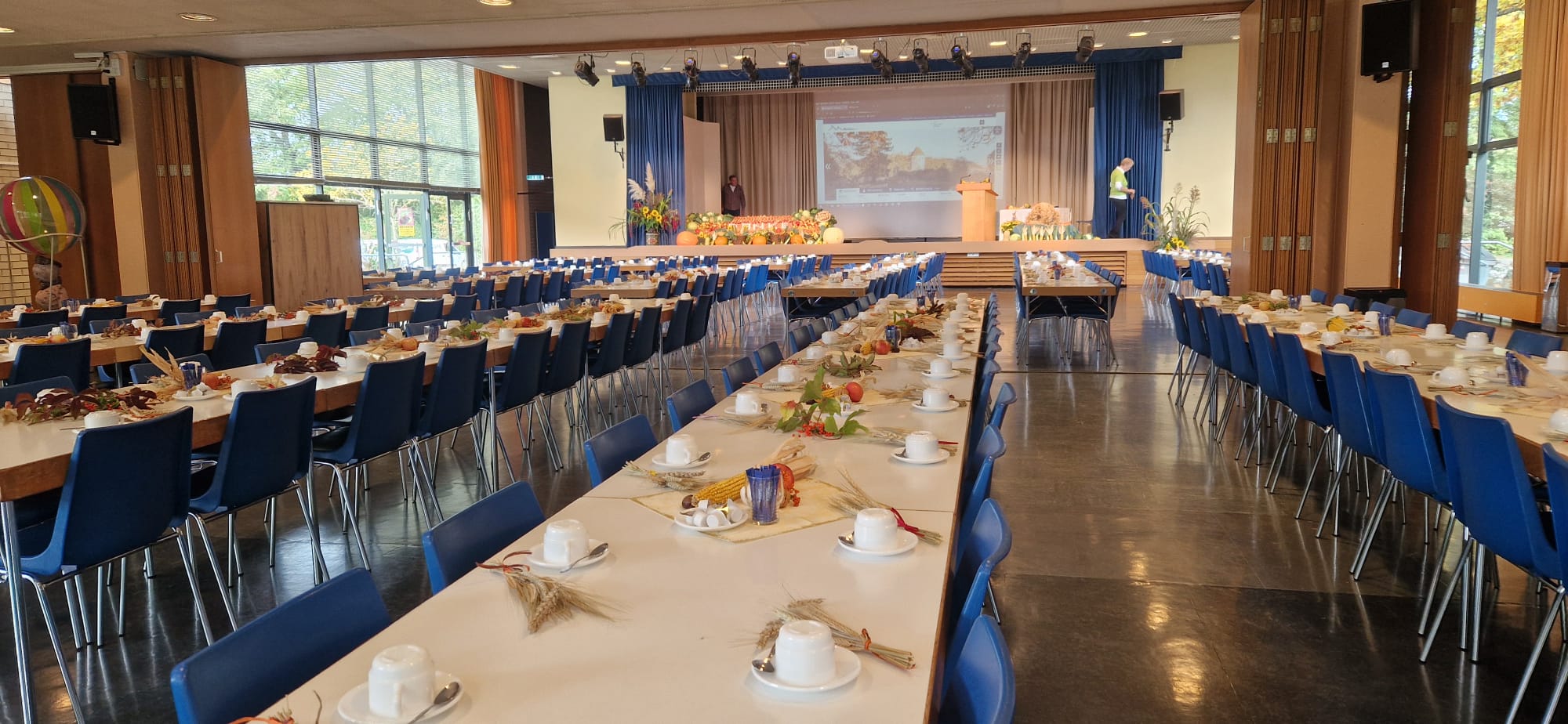 Bereits ab 9 Uhr traf sich die Vorstandschaft der LandFrauen sowie Mitglieder der Landjugend, um den Festsaal vorzubereiten. Die Tische wurden mit Tassen, kleinen Erntesträußchen und herbstlicher Dekoration eingedeckt. Die Bühne wurde für die Rednerin hergerichtet und mit liebevoll geschmückten Milchkannen ausgestattet. Parallel wurden Laugenstangen vorbereitet, die Kuchentheke sowie der Getränkeverkauf aufgebaut. Der Erntealtar wurde von der Landjugend gestaltet – auch mit Erntegaben aus unserem Verein.