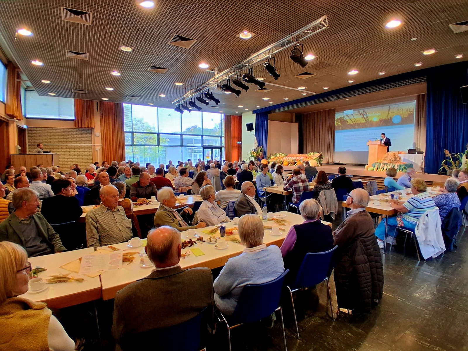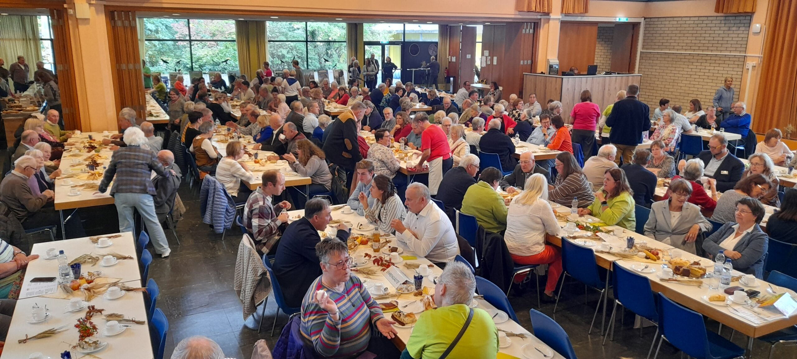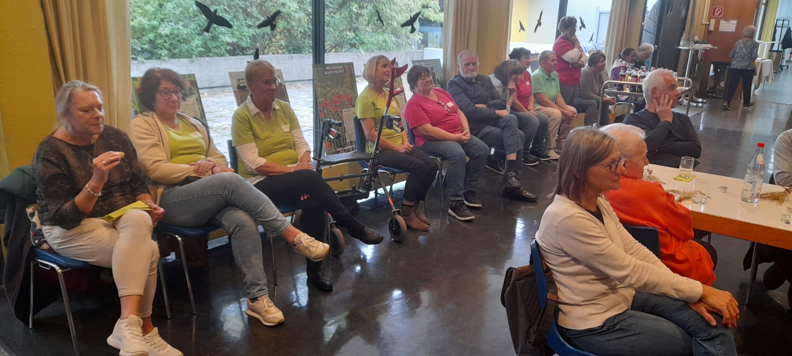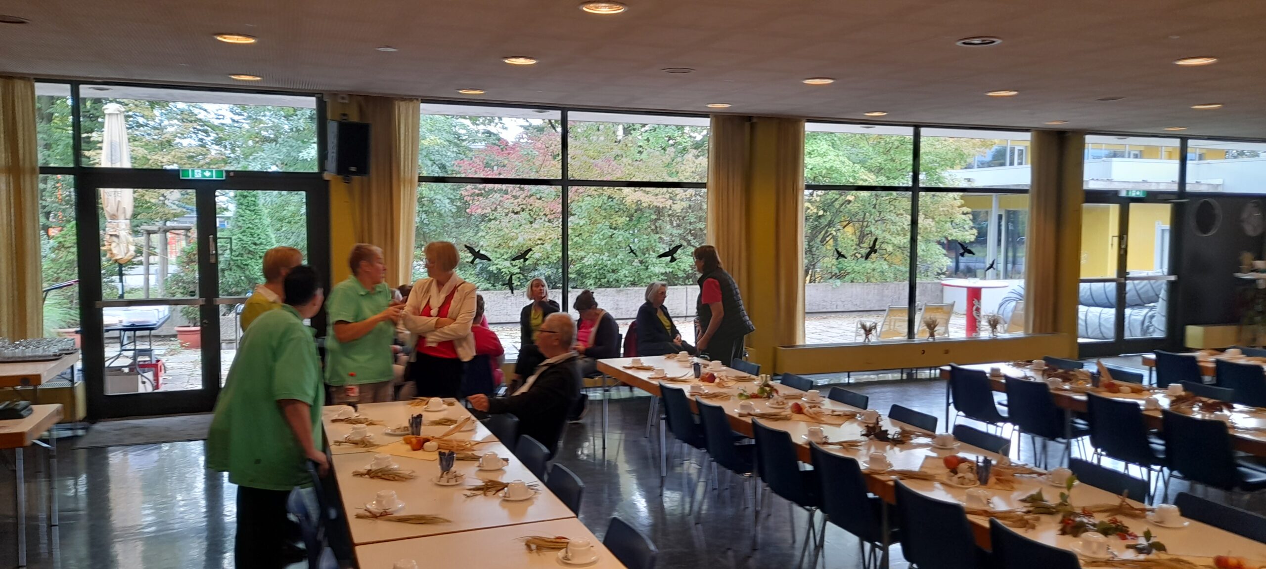 Ab ca. 13:15 Uhr trafen die Besucherinnen und Besucher ein, und der Saal füllte sich zusehends. Herr Berger vom Bauernverband brachte das traditionelle Ernte Rad sowie Informationsmaterial mit. Die LandFrauen kümmerten sich um die Kaffeeausgabe, während Kuchen und Getränke von den Gästen selbst geholt werden konnten. Die Ehrengäste wurden herzlich begrüßt und zu ihren Plätzen begleitet.